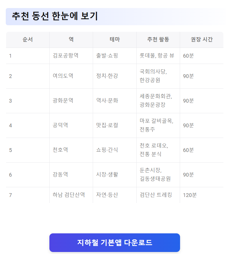 | 순서 | 역(출구 예시) | 테마 | 주요 포인트 | 권장 시간 |