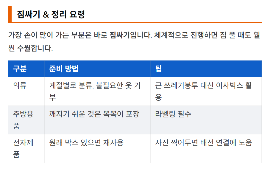 - 짐 포장 시작: 덜 쓰는 물건부터 미리 포장